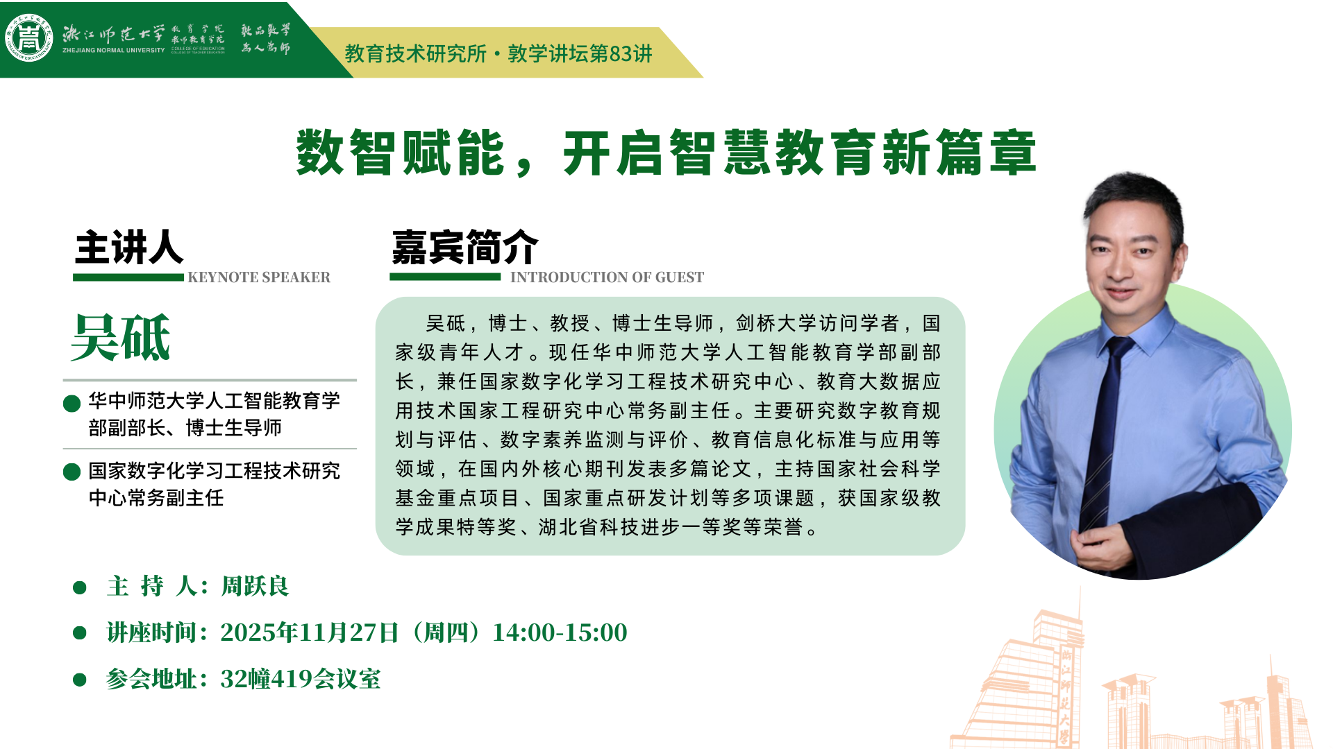 2025年11月27日(周四)下午14:00,华中师范大学人工智能教育学部副部长、兼任国家数字化学习工程技术研究中心、教育大数据应用技术国家工程研究中心常务副主任吴砥教授将于32幢419会议室,主讲教育技术研究所系列讲座暨敦学讲坛第83讲《数智赋能,开启智慧教育新篇章》。欢迎广大师生踊跃参加!