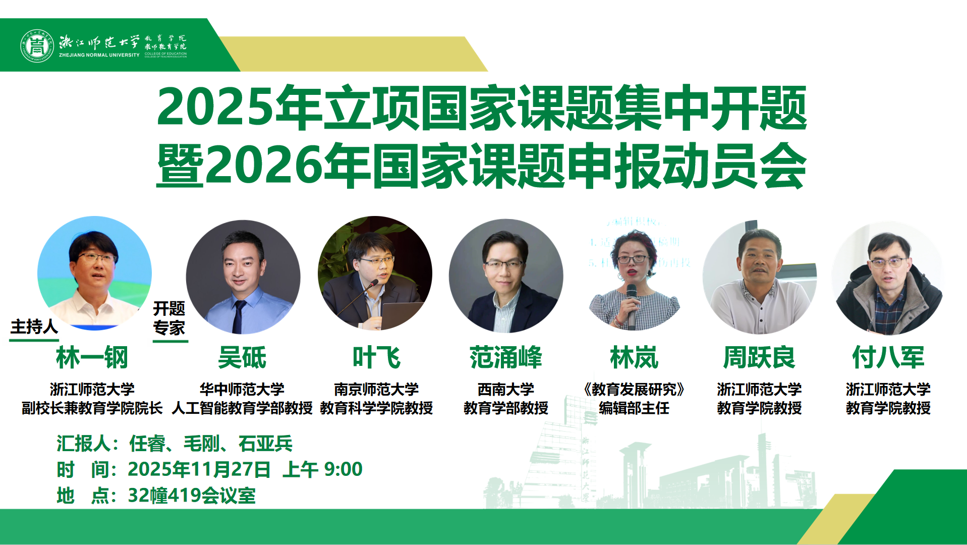 2025年11月27日(周四)上午9:00,教育学院(教师教育学院)将于32幢419会议室,隆重举行2025年度国家课题集中开题暨2026年度申报动员会。本次会议特邀多位资深专家莅临指导,包括:华中师范大学人工智能教育学部吴砥教授,南京师范大学教育科学学院叶飞教授,西南大学教育学部范涌峰教授,《教育发展研究》编辑部林岚主任,浙江师范大学教育学院周跃良教授,浙江师范大学教育学院付八军教授。会议由浙江师范大学副校长兼教育学院院长林一钢教授主持。