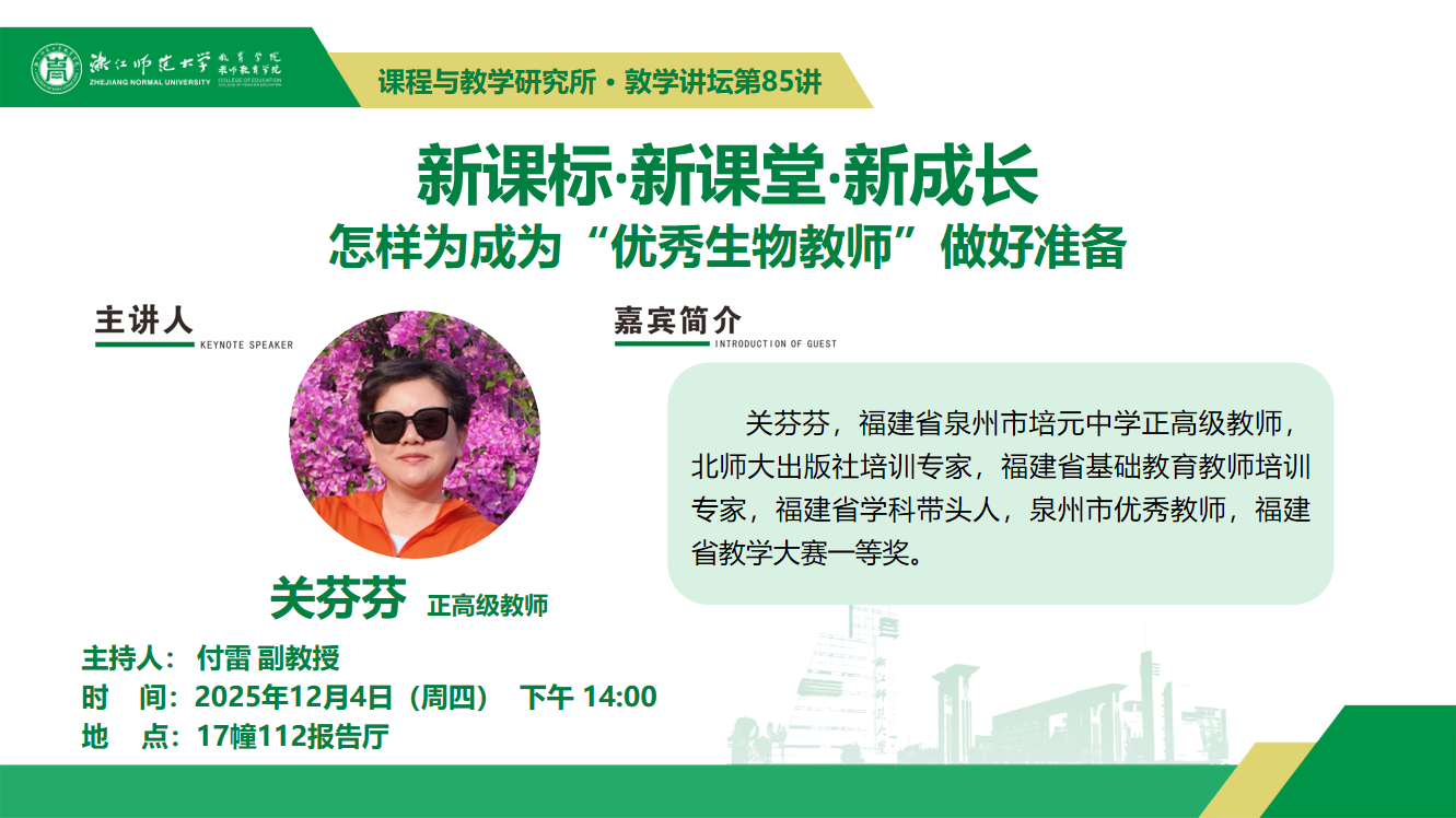 2025年12月4日(周四)下午14:00,福建省泉州市培元中学正高级教师、北师大出版社培训专家、福建省基础教育教师培训专家、福建省学科带头人 关芬芬老师将于17幢112报告厅,主讲课程与教学研究所系列讲座暨敦学讲坛第85讲《新课标·新课堂·新成长,怎样为成为“优秀生物教师”做好准备》。欢迎广大师生踊跃参加!