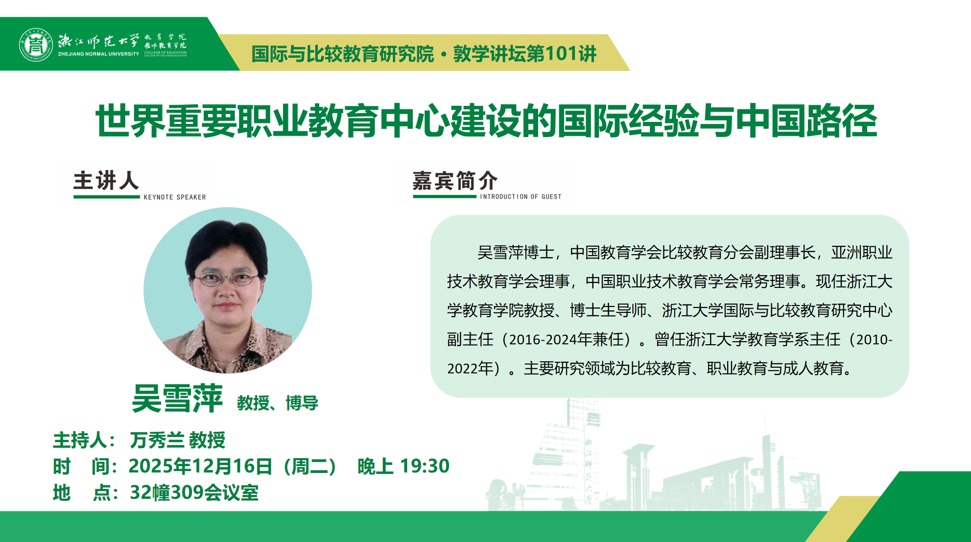 12月16日(周二)晚上19:30,浙江大学教授、博士生导师吴雪萍将于32幢309教室,主讲国际与比较教育研究院系列讲座暨敦学讲坛第101讲《世界重要职业教育中心建设的国际经验与中国路径》。主持人为万秀兰教授。