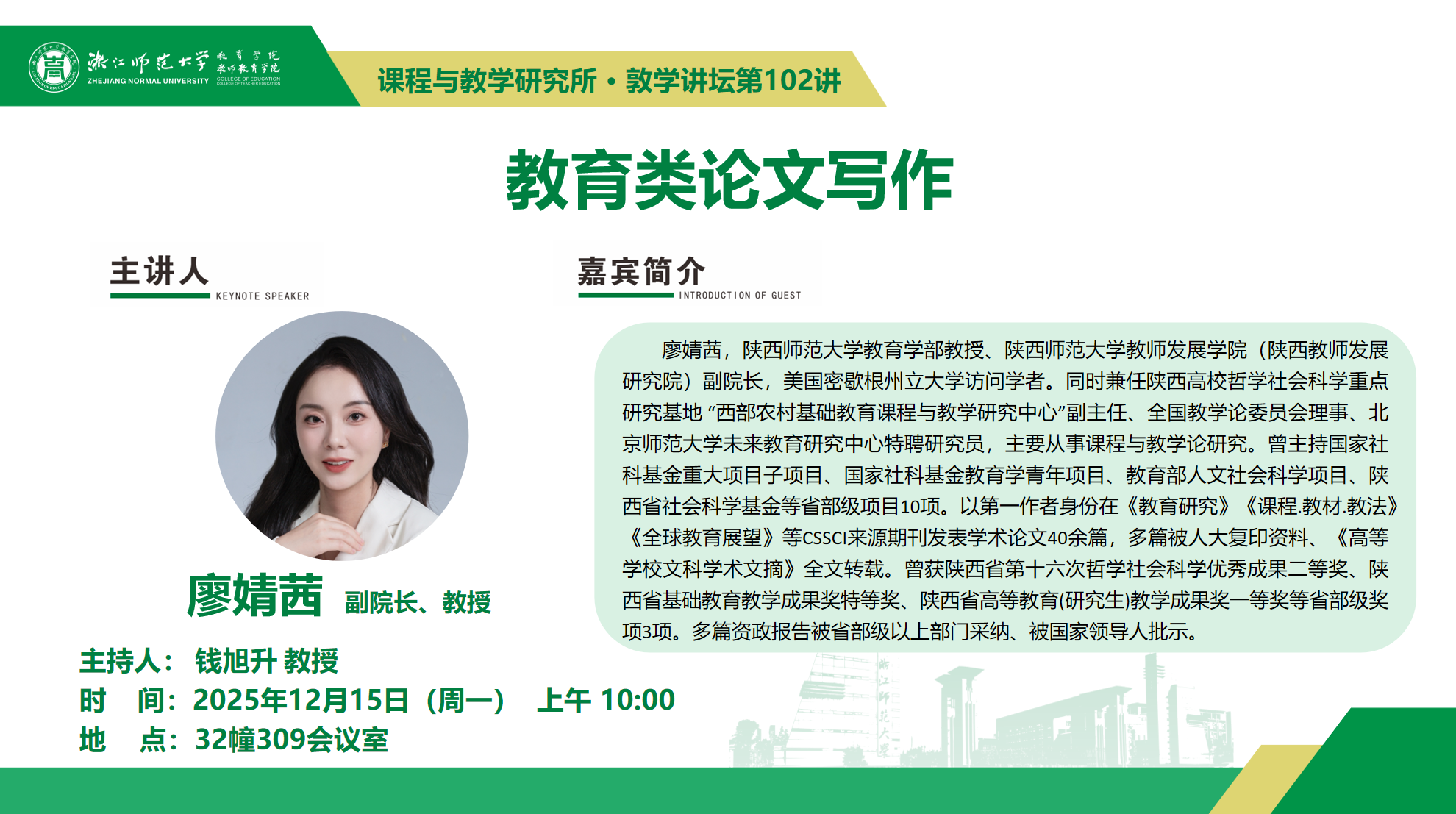 12月15日(周一)上午10:00,陕西师范大学教育学部教授、陕西师范大学教师发展学院(陕西教师发展研究院)副院长,美国密歇根州立大学访问学者、陕西高校哲学社会科学重点研究基地“西部农村基础教育课程与教学研究中心”副主任、全国教学论委员会理事廖婧茜将于32幢309会议室,主讲课程与教学研究所系列讲座暨敦学讲坛第102讲《教育类论文写作》。主持人为钱旭升教授。