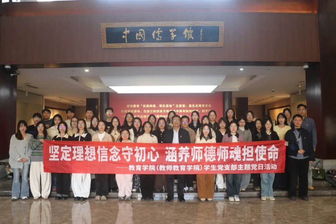 为筑牢党员理想信念,厚植师德教育根基,12月10日,教育学院(教师教育学院)组织学生党员前往衢州开展主题党日活动。学院党委书记苏煜、党委副书记王晓均、学生党支部书记及部分学生党员共同参加。全体成员沿着“清廉筑基、红色铸魂、儒学润心、国际担当”的研学路线,走进盈川清廉文化馆、孔氏南宗家庙、中国儒学馆和杜立特行动纪念馆等场馆,在实地研学中接受党性淬炼与师德浸润。