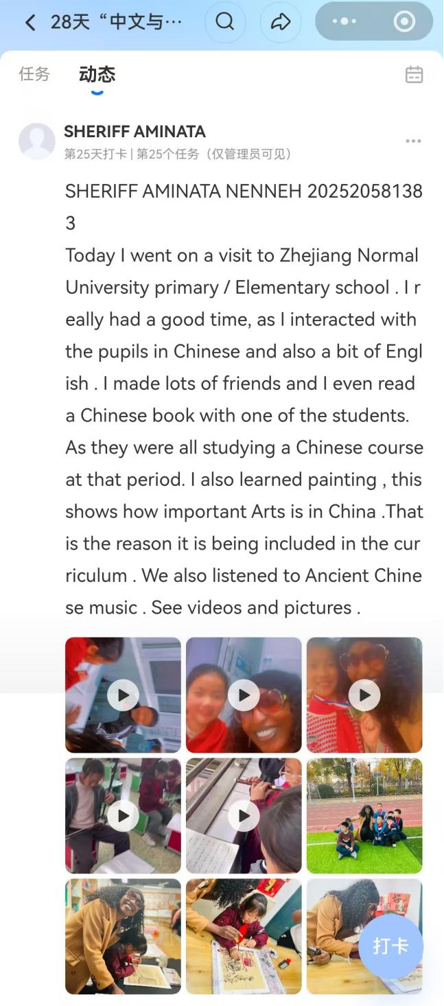 为期28天的国际学生中文学习打卡活动虽已结束,但对汉语与中国文化的探索永无止境。这段沉浸式的学习之旅,是对“与汉学结伴、和中国同行”的生动践行,也印证了:中文学习的每一程积累、文化探寻的每一次前行,皆为文明互鉴的扎实足迹,都在书写文化交流的当代篇章。