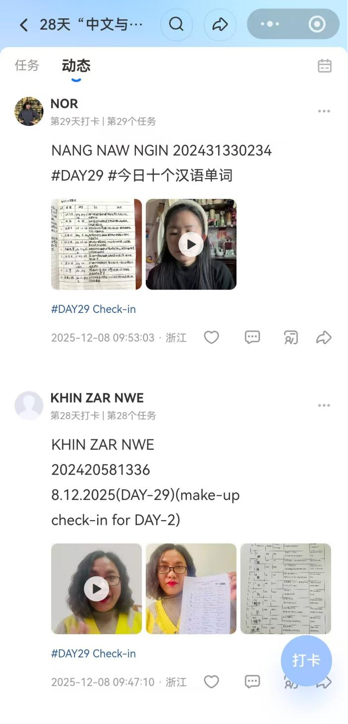 我觉得28天的中文学习既充满挑战又很有趣,让我更深入地触摸到中国文化的温度。这次活动需要极强的自律和坚持,但确实帮助我提升了中文水平!我对中国文化的热爱,也正随着语言能力的提升而日益增长。 期待下一轮挑战!