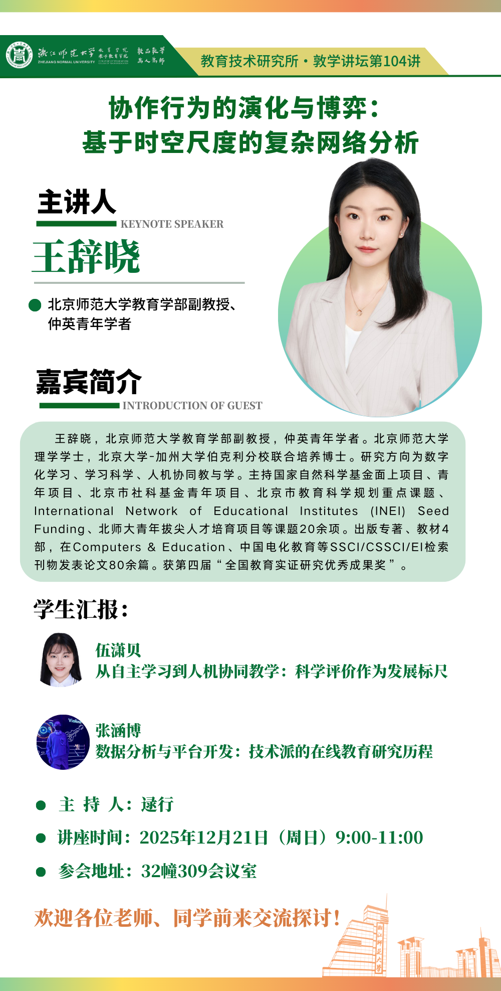 12月21日(周日)上午9:00,北京师范大学教育学部副教授、仲英青年学者王辞晓将在32幢309会议室,主讲教育技术研究所系列讲座暨敦学讲坛第104讲《协作行为的演化与博弈:基于时空尺度的复杂网络分析》。