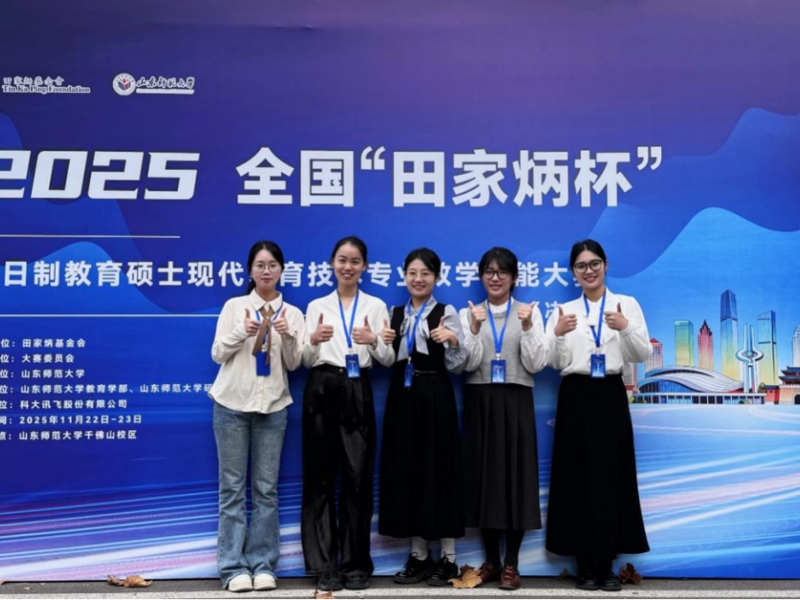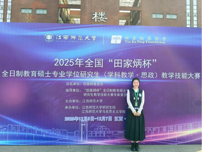习宾旭和胡瑶琦同学在比赛现场 学科教学(思政)专业共吸引了来自全国98所高校的254名选手晋级决赛,经过激烈角逐,大赛共评出一等奖26名、二等奖51名、三等奖103名。我院学科教学(思政)学生王雪(指导老师:程力、张啸尘)获得三等奖,沈虹君(指导老师:程力)获得优秀教学设计奖。 王雪同学在比赛现场 沈虹君同学在比赛现场 现代教育技术专业共有来自87所高校的398名选手参与初赛,200名选手晋级决赛,最终产生一等奖20名、二等奖40名、三等奖80名、优秀教学设计奖56名、优秀指导教师奖50名。我院选派参赛的5名研究生全员晋级决赛,并在决赛中全部获奖,其中杨梦洁(指导老师:黄昌勤、黄琼浩)、张婉嫔(指导老师:韩中美)荣获二等奖,张婉露(指导老师:朱佳、李鸣华)、沈伊洁(指导老师:阮高峰)、沈雨欣(指导老师:方向)荣获三等奖。黄昌勤、韩中美老师荣获“优秀指导教师奖”。 张婉嫔、沈雨欣、杨梦洁、沈伊洁、张婉露在比赛现场 至此,我院各专业教育硕士本年度参与的全国“田家炳杯”全日制教育硕士专业学位研究生教学技能大赛完美收官,学生获奖共计30人次,指导教师获奖共计12人,是参赛5年以来取得的最好成绩。 全国“田家炳杯”全日制教育硕士专业学位研究生教学技能大赛是全国影响与规模较大的教学技能竞赛,由田家炳基金会冠名,全国教育硕士专业学位研究生教学技能大赛专家委员会指导,赛事旨在展示全日制教育硕士专业学位研究生的教学能力及培养院校的培养成果,交流研究生培养经验。 学院始终将高水平教学竞赛视为锤炼学生实践能力的重要平台,系统推进教育硕士教学素养的全面提升和人才培养模式的持续创新,在赛事中取得显著成效,不仅展现了学生扎实的专业功底,更是学院持续推进教育教学改革取得实效的鲜明例证,进一步彰显了学院育人工作的成果。未来,学院还将继续加强教育硕士综合技能训练,着力培养更多具备先进理念、扎实技能与教育情怀的优秀教师,为基础教育发展贡献更多力量。