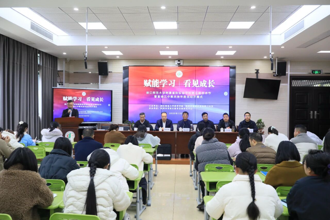 12月23日,浙江师范大学附属富阳实验学校举行第五届“赋能学习·看见成长”学术节暨教共体年度活动开幕式。杭州市富阳区教育局党委委员、副局长周喜军,浙江师范大学教育学院(教师教育学院)教授、博士生导师张立新,浙江师范大学教育学院(教师教育学院)教授、派驻附属富阳实验学校联系专家李欣,杭州市富阳区贤明中学书记王海华,杭州市富阳区万市中学书记、校长吴勇华,浙江师范大学附属富阳实验学校书记曹振华,以及学校全体教师和教共体成员校教师代表出席了开幕式。