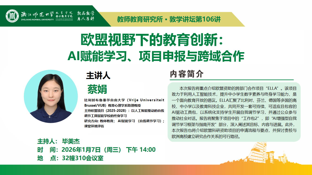1月7日(周三)下午14:00,比利时布鲁塞尔自由大学(Vrije Universiteit Brussel/VUB)教育心理学系助理教授蔡娟将于32幢310会议室,主讲教师教育研究所系列讲座暨敦学讲坛第106讲《欧盟视野下的教育创新:AI赋能学习、项目申报与跨域合作》。主持人为毕美杰老师。