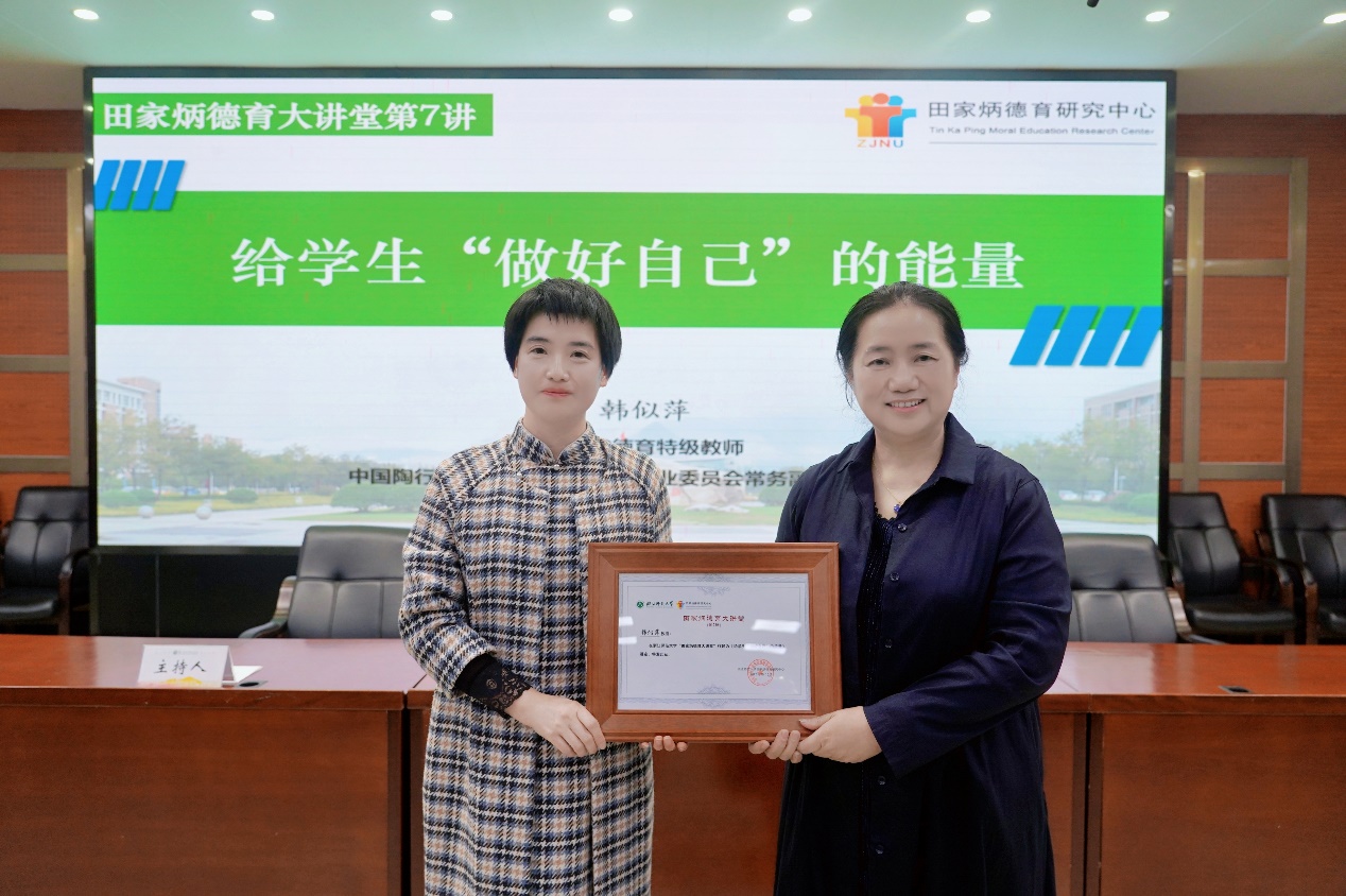 最后,中心常务副主任查颖教授为韩老师颁发“田家炳德育大讲堂”纪念证书。