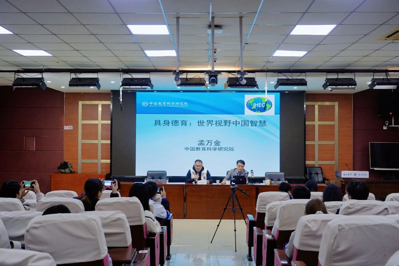 最后,孟教授阐述了“具身德育的中国智慧”。他认为古代的具身德育思想博大精深,诸如“安身方可立命”等包含着深刻的具身哲学思想。古代中和位育观源远流长,《中庸》《素问》等经典著作中包含着深刻的“天人合一”“身心一体”的具身理念。中国优秀德育传统,诸如群己和谐、天人和谐的道德价值观,知、情、意、行健全的品德心理要素观、“内圣外王”的德育理想境界观、厚德载福的德育动力观、“知-好-乐”的德育过程序列观、礼乐结合的德育方法观等在现今的德育实践中仍旧适用、仍然管用。他总结道:“立德树人是优秀传统,也是当今教育的根本任务,更是具身德育的灵魂和宗旨。”