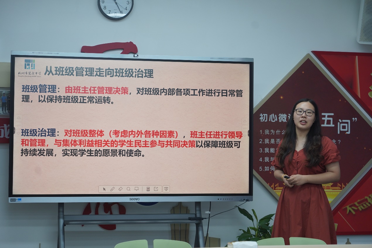 其次,政教负责人汪心怡重点聚焦“学校德育体系建设”。她指出,学校通过各种措施来营造积极向上的班级文化。比如,通过让学生制定班名、班规、班训、班歌、班花、班徽等班级文化要素,增强学生对于所在班集体的认同感和归属感。在班级规则的制定过程中,采用民主集中制,融入“契约精神”,让每一个学生都参与到班规、班约的制定中,确保班规的合理性,以此提高学生对于班规的认同度。此外,通过举办形式多彩的校园文化活动,支持学生的全面发展和梦想实现。