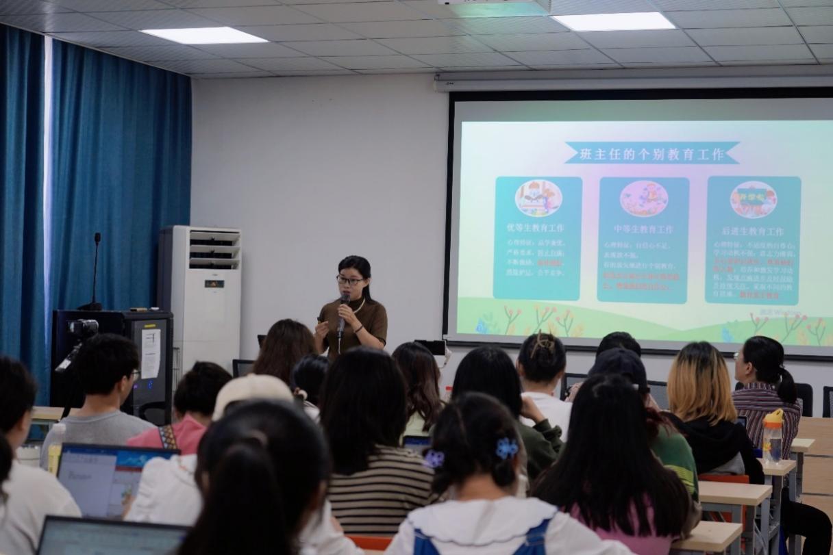 讲座伊始,童老师以教育工作中“如果你是一个班主任”为序引,指出当下班主任工作的重要性与艰巨性,并且提出“智慧型班主任是学校满意、家长满意和自己满意的班主任”。随后,童老师从个别教育工作和常规工作两个方面展开讲解。具体而言,个别教育工作面向的三类不同的学生群体。第一类学生群体通常品学兼优、严格要求自我,因此教师需要对其进行不断激励、弥补挫折、消除嫉妒、促进公平竞争的教育;第二类学生群体往往自信心不足、表现欲不强,需要为他们创造充分展示个体才能的机会,增强他们的自信心;第三类学生群体往往具有不适度的自尊、学习动机不强、意志力薄弱等心理特质,因此需要时时关心爱护、尊重他们的人格,培养和激发学习动机、鼓励进步并持续关注。