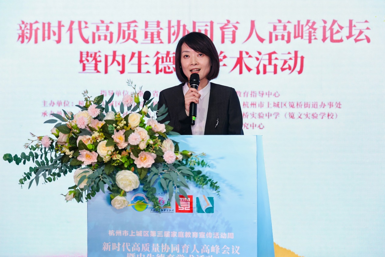 在经验分享环节,浙师大附属杭州笕桥实验中学(笕文实验学校)、笕桥街道、建兰中学学生家长、上城区妇联、家庭教育共同体分别从不同视角分享了育经验,探寻凝聚家校社协同育人力量,打造上城协同育人新生态,促进孩子全面健康幸福成长。