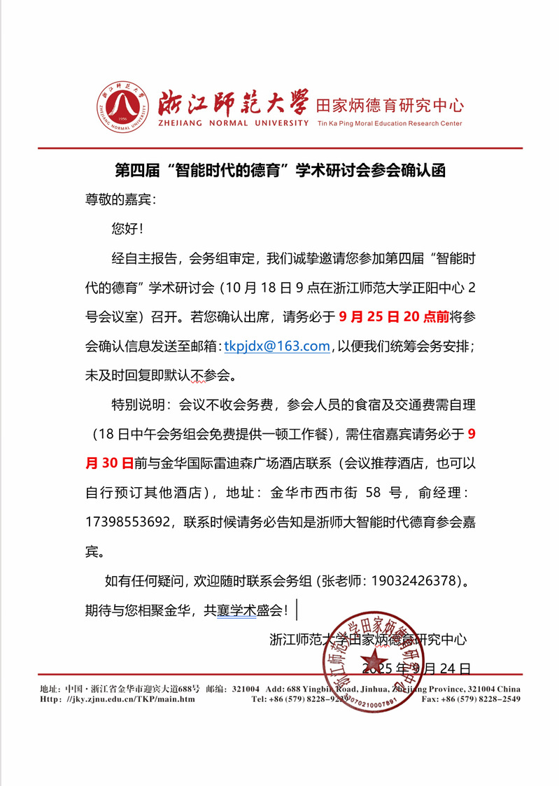 第四届“智能时代的德育”学术研讨会参会确认函