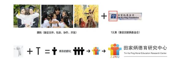 人形图案是由字母“T”与圆形组成,其中圆形象征着聚合、统合、融合,字母“T”与田家炳基金会的标识一脉相承,与田家炳基金会中“促进道德教育,弘扬中华文化,融合世界文明”的使命相统一。人形图案下方的“ZJNU”为浙江师范大学的缩写,这寓意着中心扎根于学校、服务于学校。三个简化的人形图案都是呈开放的拥抱姿态,整体上看为非封闭性结构,寓意着关怀、包容、协作、开放,与中心“立德树人,德育为先,秉承传统,面向未来”的发展理念相契合。同时,三个简化的人形图案采用聚合的排列形式,象征着中心将走多学科融合、多机构协同的发展之路。